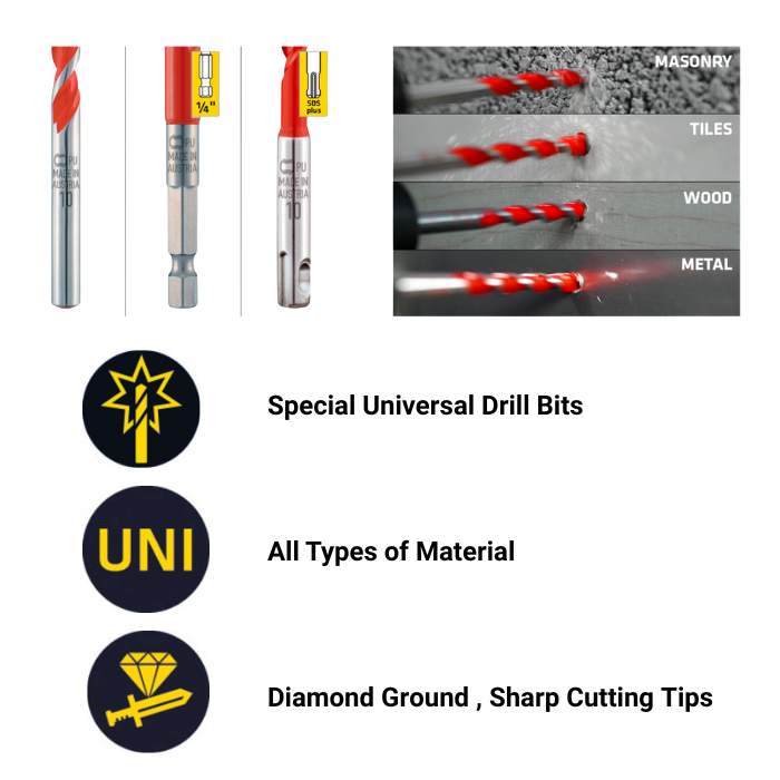 Applications: Ideal for contractors, installers, and serious DIY users who face changing substrate types and need flexibility without swapping bits. Works in standard cordless drills, hammer drills (with SDS version), and for both wood and masonry tasks.