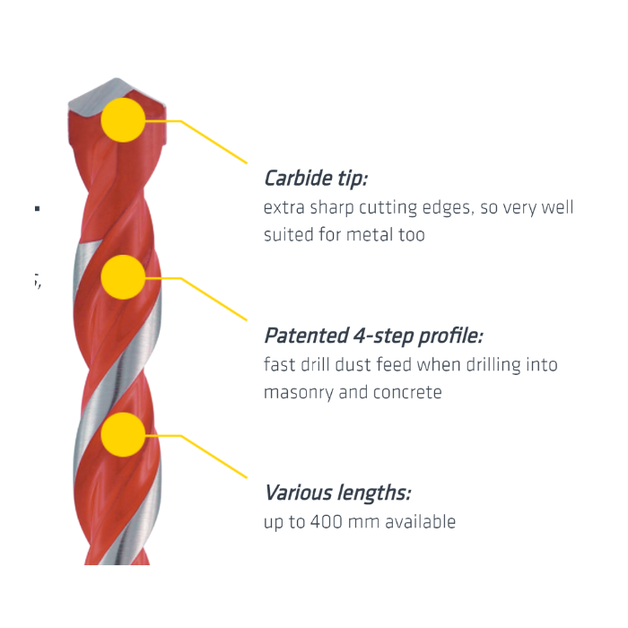 Patented 4-step profile for fast dust removal and smoother drilling in masonry or hollow brick.
